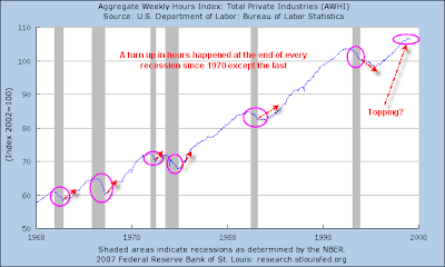 This chart is crystal clear. There has been a turn down in average weekly hours in every recession since 1968. This makes a perfect 6 for 6. One interesting factoid is that there was a sharp rebound in aggregate hours at the end of every recession except the last one. The big question however, is "Are we topping now?" I think we are. The next chart provides the clue.