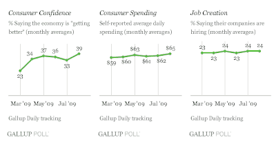 Gallup Daily economic data aggregated on a monthly basis show that job creation in August is just not taking place in the U.S. economy. While Gallup data for the month also show a slight moderation in job loss, this is not sufficient to take up the slack for a 35% decline in the rate of job creation compared to a year ago. And, while confidence in the future direction of the U.S. economy is at its highest level in 20 months, Gallup data also show a continued delinking of consumer spending -- which is down 33% from a year ago.Many think that consumer spending will return once job creation picks up. Actually, there is so much consumer debt, and for many, no reasonable way to service it, that consumer spending is likely to remain weak and defaults high even after unemployment starts inching back down.