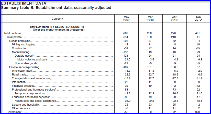Please consider the Bureau of Labor Statistics (BLS) May 2010 Employment Report.